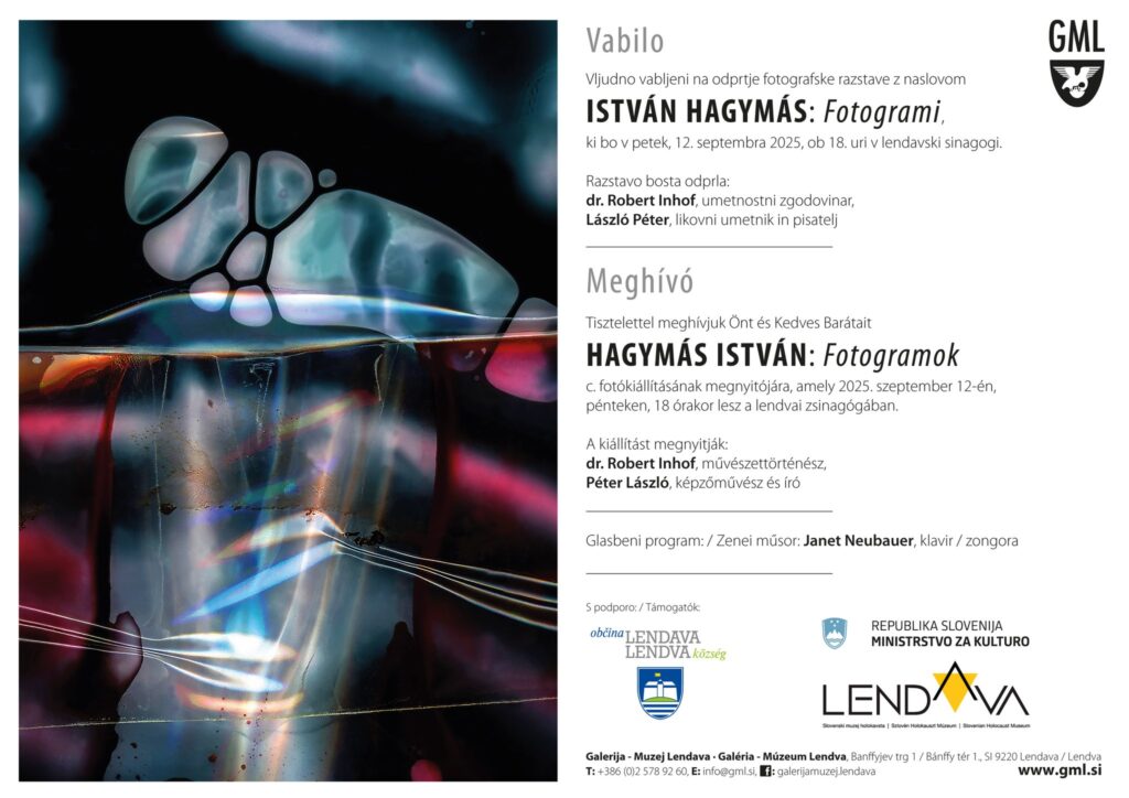 Vabimo vas na otvoritev razstave z naslovom FOTOGRAMI Istvána Hagymása, ki bo v petek, 12. septembra 2025 ob 18. uri v lendavski sinagogi.