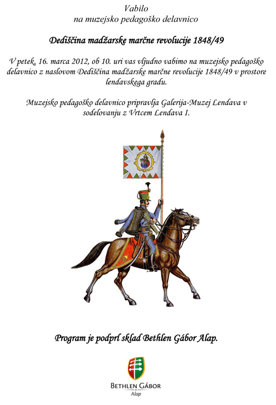 V petek, 16. marca 2012, ob 10. uri vas vljudno vabimo na muzejsko pedagoško delavnico z naslovom Dediščina madžarske marčne revolucije 1848/49 v prostore lendavskega gradu.
